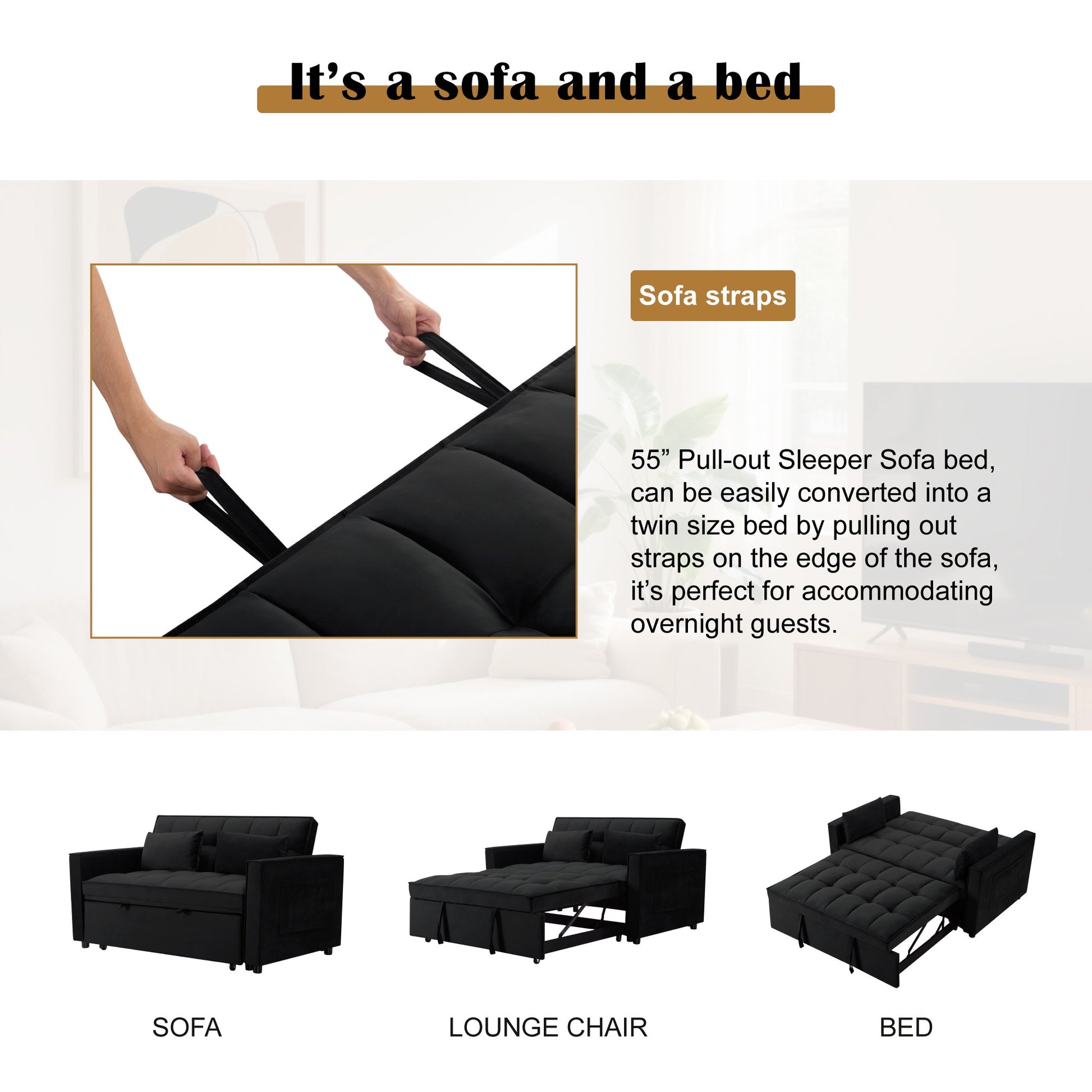 Experience the perfect blend of comfort and functionality with the CAFORKP 55” Pull-out Sleeper Sofa Bed. Designed for modern living, this stylish velvet-upholstered sofa easily transforms into a cozy twin-size bed, making it ideal for overnight guests or small-space living. The solid wood frame ensures durability, while the adjustable 3-position backrest lets you sit upright, recline, or lie flat with ease. A convenient side pocket keeps remotes and magazines within reach, and two matching pillows add extra comfort. Whether you're furnishing a guest room, studio apartment, or home office, CAFORKP brings versatile charm and everyday convenience.