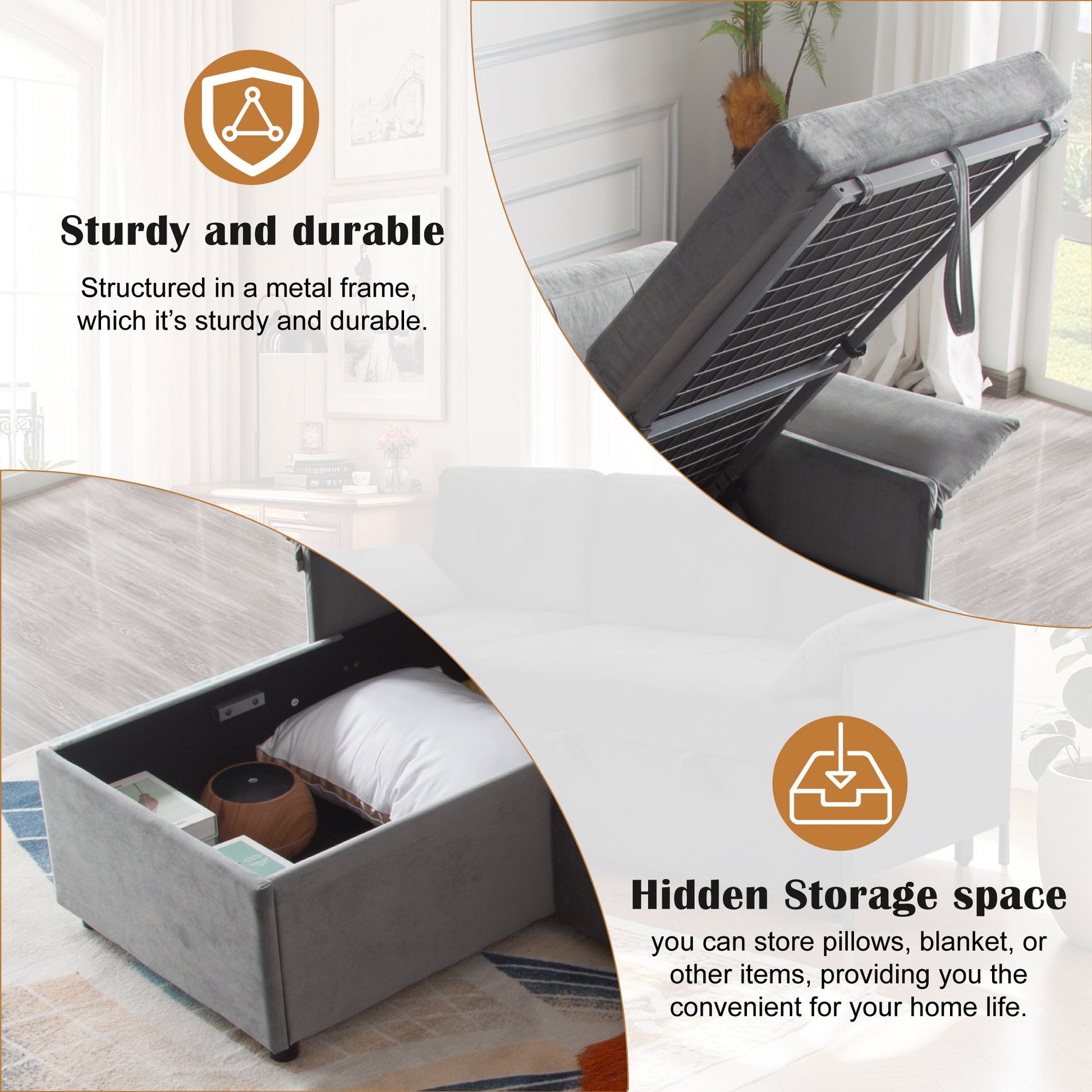 • Reversible Chaise with Storage: The chaise can be placed on either left or right side to suit your space, with hidden storage for blankets, pillows, or daily essentials — perfect for small living spaces.