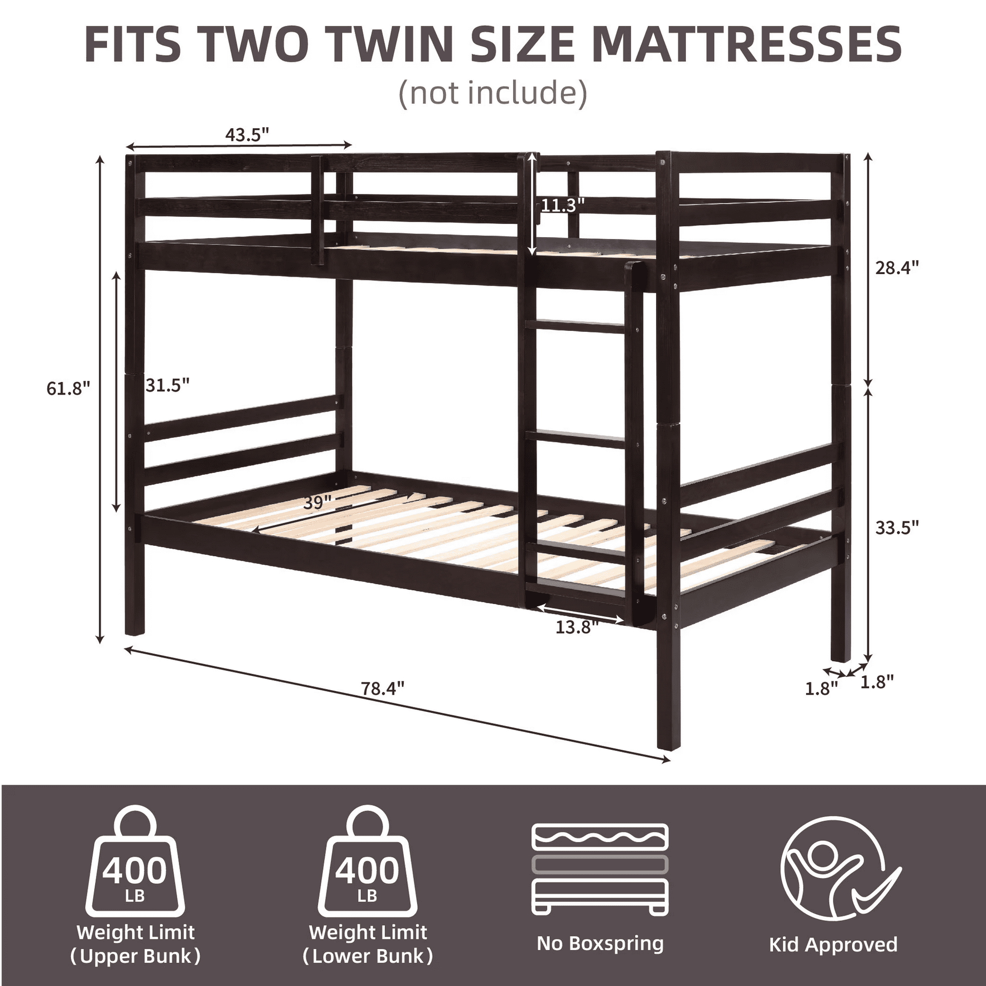 CAFORKP Solid Wood Bunk Bed for Kids with Safety Guardrail, 400 lbs Weight Capacity - Dark Brown