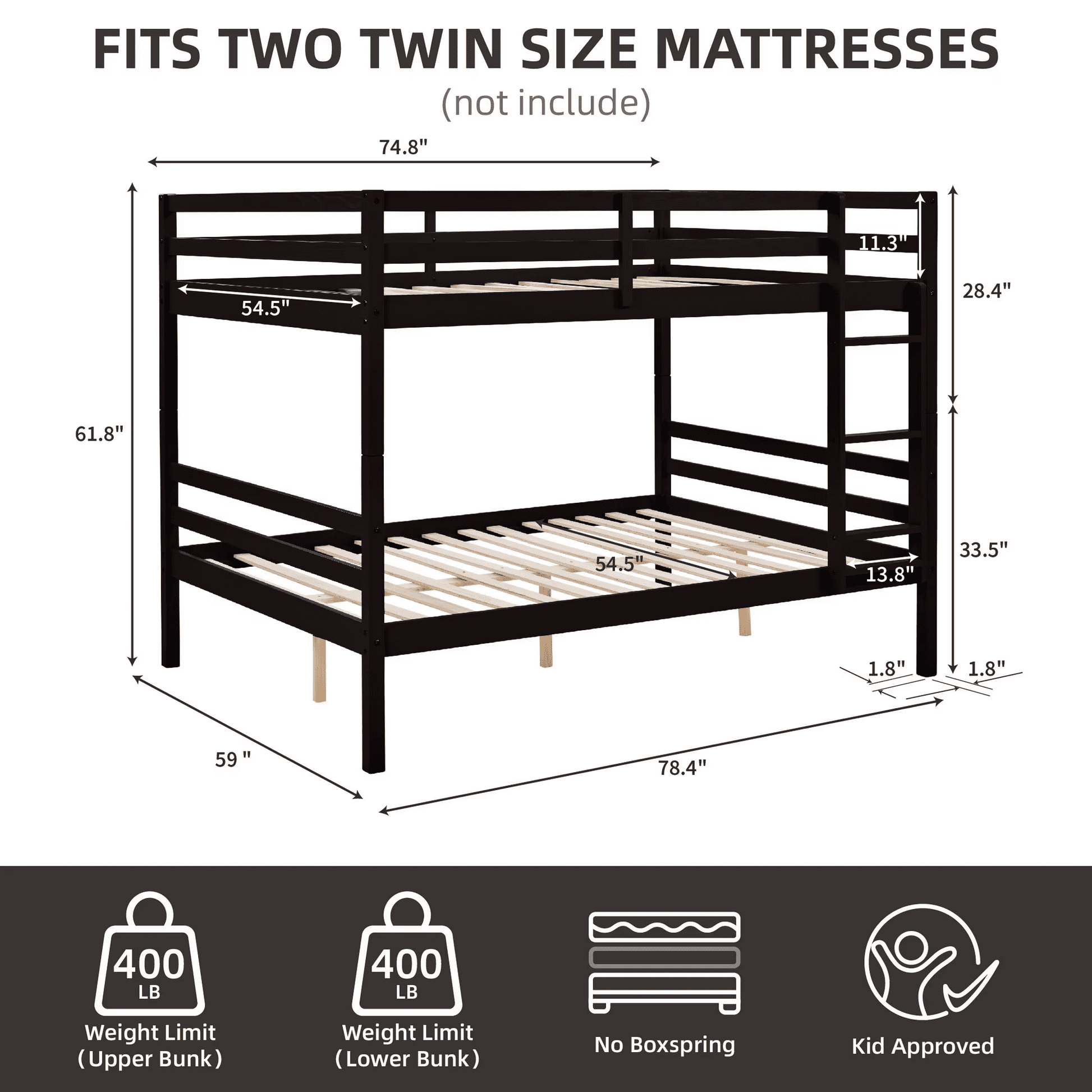- Sturdy Solid Wood Construction: Built from premium natural wood, this bunk bed ensures exceptional durability and long-lasting use, supporting up to 400 lbs.