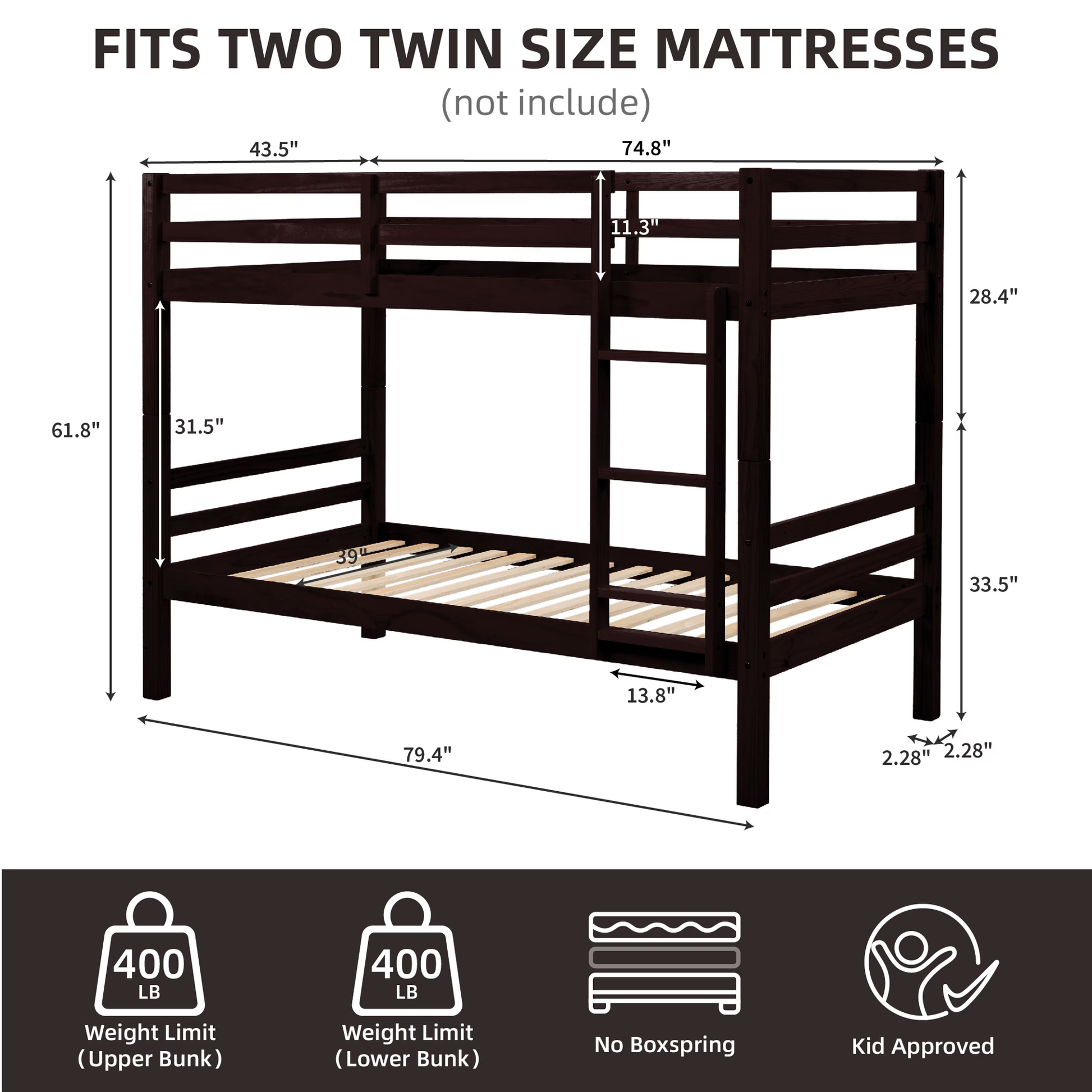 - Space-Saving Twin Over Twin Design: The twin-over-twin layout maximizes vertical space, making it ideal for shared bedrooms, dorms, and guest rooms.