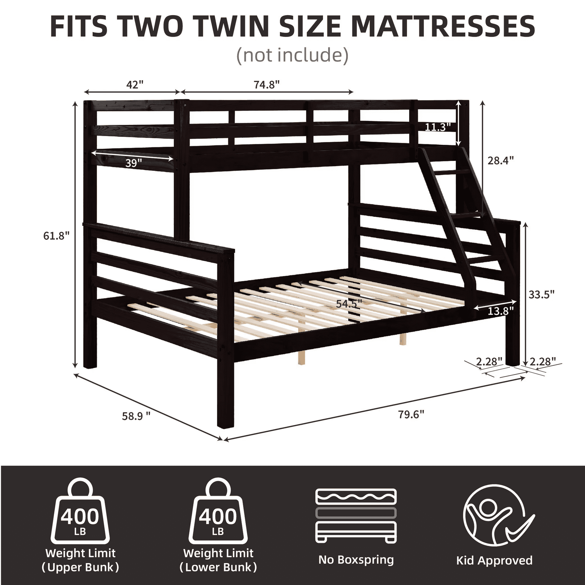 CAFORKP Twin Over Full Wooden Bunk Bed with Thick Posts, High Guardrail & Ladder for Kids, Brown
