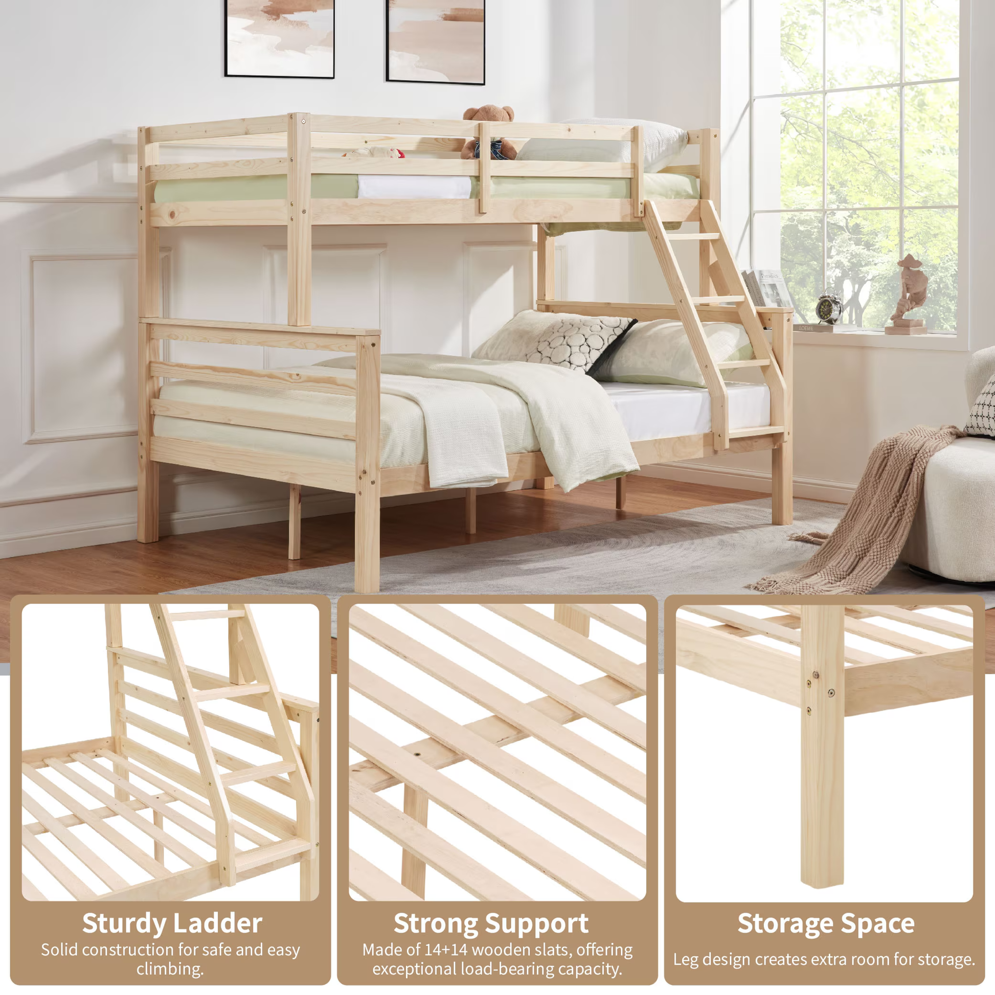 CAFORKP Twin Over Full Wooden Bunk Bed with Thick Posts, High Guardrail & Ladder for Kids, Natural Wood