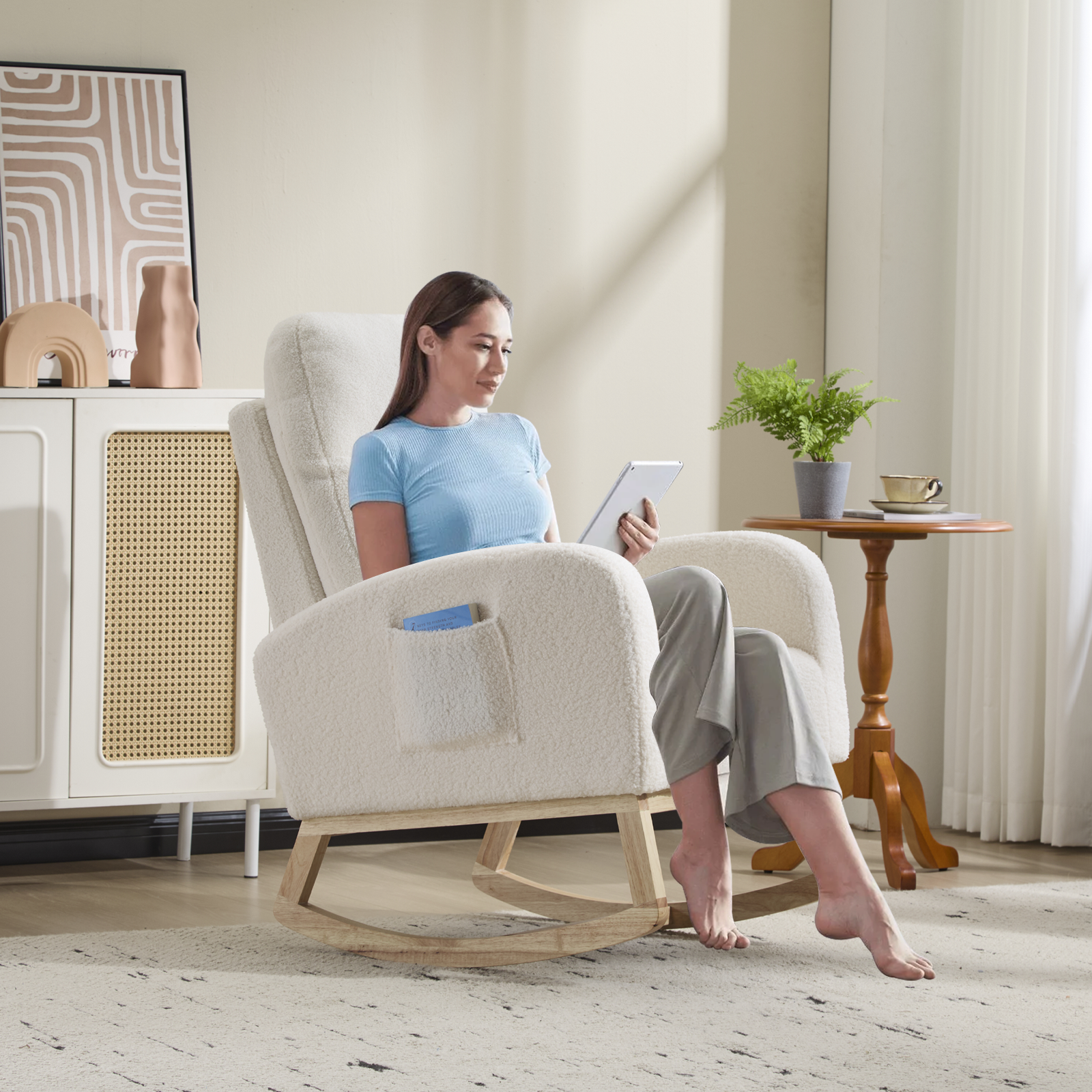 CAFORKP Upholstered Nursery Rocking Chair with High Back, Side Pocket, Wood Base, White
